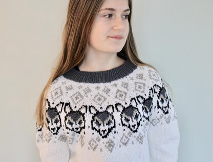 This sweater might be an ironic piece of knitwear, since the wolf is not nice to the sheep all knitters love. In itself, it is a “wolf in sheep’s clothing”. However, the wolf is a beautiful animal and has been a symbol of the warrior in many cultures for centuries.