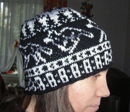 I proudly present my definitive wolf pack beanie! 6 big wolves (2 different ones) are running around this beanie. It is completely knitted in 4-ply sock yarn. But you can also use Acrylic yarn of similar weight or 5-ply yarn (like Buttinette Madeleine Merino) for bigger sizes. There is a cute corrugated (two-color) ribbing, followed by a paw peerie (border pattern) and the hunting wolves. You can see the dark forest in the background, some night birds/bats flying through the night air. You can see the clouds and a full moon. At the top of the beanie is a lovely star.