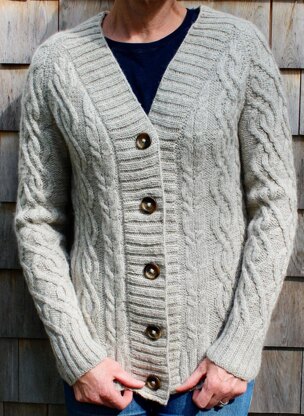 This is a long-ish, cable-knit cardigan. The pattern has been re-written to be more size inclusive and has been tech-edited. It is very warm, and perfect for snowy days and glasses of wine by the fire. This yarn is resilient and good for standing up to moths, so you should have this sweater to enjoy for many winters!