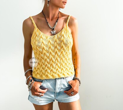 Women’s cable knit top pattern includes 5 sizes: XS, S, M, L, XL for bust 78 - 98 cm / 30.7” – 38.6”, girl on picture: bust 82 cm/32,3’’, waist 60 cm/23,6’’, hips 88 cm/34.6”, height 161 cm/63,4”, cropped tank top size XS.