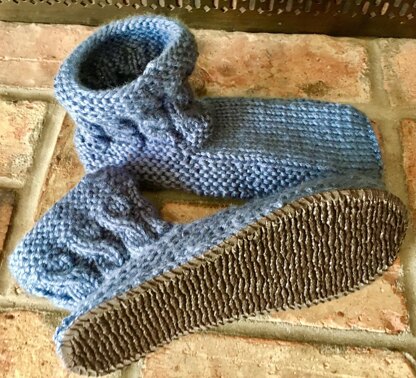 Slippers are knit top down with a cable pattern on the cuff worked in a round. Foot is worked flat, side in a round and bottom again flat. A rubber sole can be purchased and added.