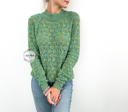 Casual sheer sweater pattern includes 5 sizes: XS, S, M, L, XL for bust 79 – 102 cm / 31.1” – 40.2”, girl on picture: bust 82 cm/32,3’’, waist 60 cm/23,6’’, hips 88 cm/34.6”, height 161 cm/63,4”, jumper size XS.