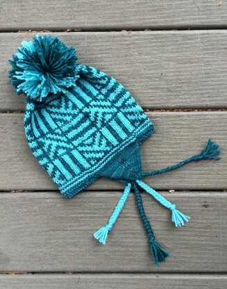 The hat comes in 2 sizes, Infant/Small Child & Large Child/Adult (please read notes below.) Knit in worsted weight yarn, beginning with earflaps knit flat then stitches cast on around them and joined to knit in the round. Topped with a “layered pom pom” - 2 colors but colors grouped separately so there are blocks of color - it’s a quick knit. 2 single color braids are added to each earflap for a little whimsy to go with the name.