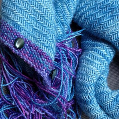 Know that herringbone stitch creates a curling garment, which actually kind of lends itself to the upside down world of Alice. This pattern has fun with it. Worn as a single loop around the neck and buttoned twisted makes it something closer to fiber jewelry. Double wrapped flat around the neck and only half buttoned allows the scarf to fold so beautifully in the back, while draping more flat in the front for display of the buttons and fringe.