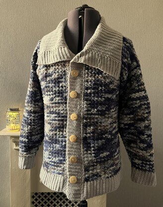 This crochet pattern is for a men's button-up cardigan, with a textured stitch which I am choosing to call a Wonky V. The design has a large collar made of a simple rib (adjustable). Sleeves taper from the cuff to a flat join to body. I have used DK acrylic to make this sweater, specifically King Cole Camouflage DK, complimented by Stylecraft Special DK in Silver