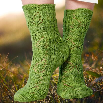 With their stylized lace leaves and textured knot stitches, worked in a bright green yarn, these socks have a pretty, botanical look.