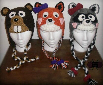 Woodland Animals Earflap Hats pattern includes instructions to make a Fox, Raccoon, Skunk, and Beaver in sizes 0-3 months all the way through Adult. These hats are easily customizable and look just as good on girls as it does boys. Also included: Small & Large Bow directions and Small & Large Heart directions.
