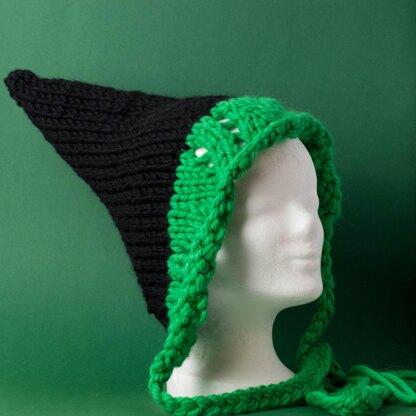 This knitting pattern is called the Woodland Wicca Hat. It is a woodland inspired witch or pixie type bonnet. The brim is made from a lace stitch that resembles leaves.