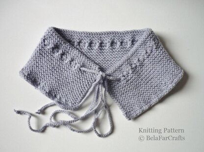 This accessory is quite easy for beginners to create using basic stitches and long straight needles. It closes with a crocheted cord, but you can also use a braided cord with the same yarn or a pretty ribbon.