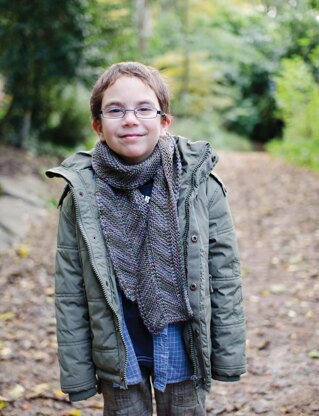 Variegated yarn seems to work so well with a simple garter stitch, highlighting the directionality of the knit piece. The main part of the scarf is worked straight up with a chevron stitch all along and is finished by working a strip of garter set against the scarf’s length.