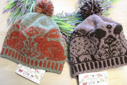 The hat pattern includes 2 motifs to choose from (sheep & rabbits). There are a few rounds with long floats and I have included an explanation of the Ladder-Back/Invisible Jacquard method. But you may tack your floats any way you like. There are also partials charts.