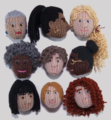 In addition to the written instructions on how to make the body, basic head, hair bun, curly hair, how to sew the knitted pieces together and how to stuff Woolly Woman, there are coloured charts for the intarsia heads and close-up photos illustrating how to make her features.