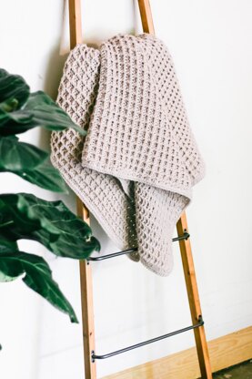In this pattern, we'll practice the waffle stitch, a technique that uses post stitches to create a grid-like effect. But what truly sets the waffle stitch apart is its irresistibly squishy texture. Snuggling in this blanket feels like being wrapped in an insulating cloud.