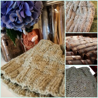 The ribbing mimics the staves on a cask while the purl bands look like the metal bands. You can knit it wrong side out or right side out, your choice.