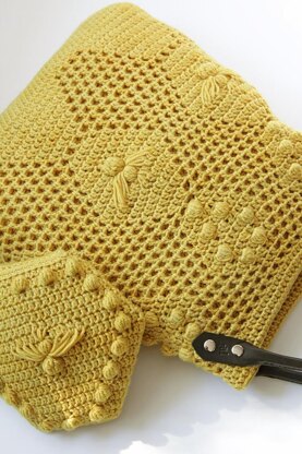 The Worker Bee Bag is a whimsical, textural bag inspired by Laurie R. King’s The Beekeeper’s Apprentice. Filet crochet is used to create a beehive filled with honey, larvae and a small cadre of worker bees.