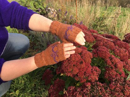 This pattern is the Worker Bees Fingerless Mitts, a cute bee colourwork detail across the knuckles on a pair of fingerless mitts.
