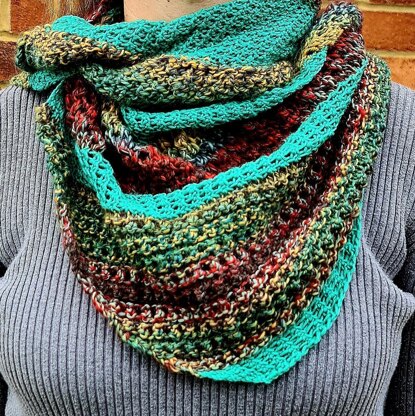 This is an asymmetric shawl for beginners that marries rows of woven stitches and different lace patterns. It includes many different lace patterns including rosette stitch, garter lace, and ridged ribbon eyelet. It is a great choice for solid and multi-colored yarn or a mixture of both.