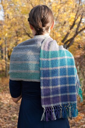 This very easy knit wrap is worked entirely in Garter stitch. The magic is in the gorgeous colours and the surface weaving that is added after the knitting is complete. The extra texture and weight from the woven effect makes a very cozy and soft wrap. Pattern includes a photo tutorial on how to add the knotted fringe.