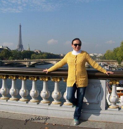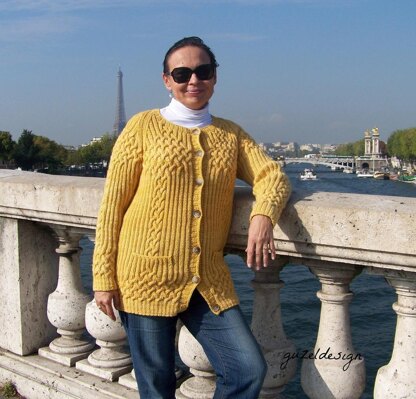 This is an almost seamless construction (“almost” means you have to sew the lining of the pockets to the cardigan). The cardigan is worked from bottom up to underarm and then the sleeves are joined and the yoke is worked in raglan shape to the neck. The yarn has been discontinued, but you can use any worsted yarn. Please be warn there are a lot of charts ( almost every size has one chart). The skills are required: