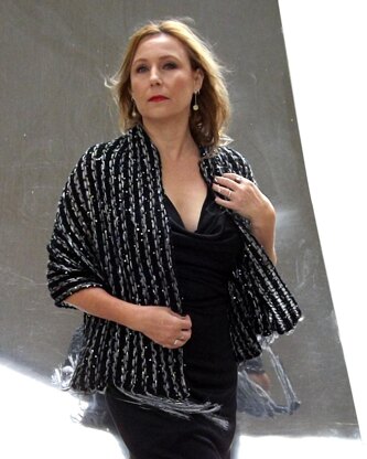 The main body of the stole is worked as a rectangle in Ladder Pattern. The metallic novelty yarns are woven through the eyelet openings with ends tied together to create fringes. Skill level: intermediate