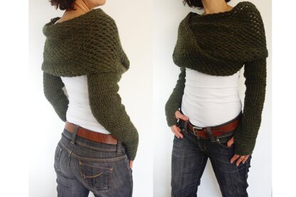 This trendy and versatile wrap around shrug is a quick and easy project. It looks great either with a casual outfit or with a sexy pair of jeans. It is warm and comfortable, the perfect accessory for any occasion, convertible into a winter scarf.