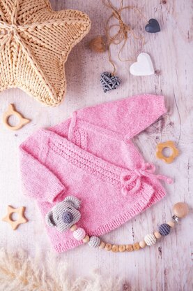Wrap is worked flat in one piece. Knitting starts from the bottom part and continues in the bottom-up direction; yoke is realized flat in raglan; sleeves are made in the round top-down on circular needles. Wrap is decorated with a lace pattern and can be joined with knitted ties (outside) and a button (inside). To make this pattern easier to follow the sizing instructions are color-coded