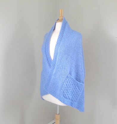 A cozy rectangle shawl wrap with handy pockets. This comfortable style is sometimes called a reader wrap.