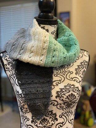 This triangle shaped short scarf is so much fun. You can wear it around your neck or your shoulders. Pull the tail through the keyhole for a closure. The pattern only calls for two stitches but is full of texture and personality. You can modify the pattern to make it longer by adding extra rows.