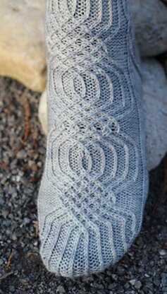 The twisted stitches in this sock give the pattern its name, reflecting the intricacies of old-fashioned wrought iron. To counter-balance how the cabled stitches pull in the fabric slightly, the back of the sock is covered with a simple 4 stitch ribbed repeat. The ribbing is slightly cabled to complement the cabling on the front of the sock.