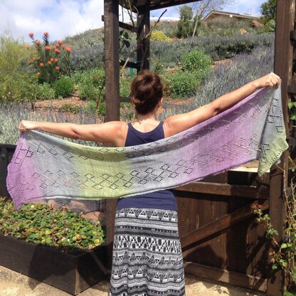 The wrap uses about 770 yards of sport weight yarn (you may also use DK or even worsted - but you will get a larger wrap and have different yardage requirements). With the simple lace motif this pattern is perfect for gradients or yarns with lots of texture. The expanses of stockinette stitch will really show off the yarn.