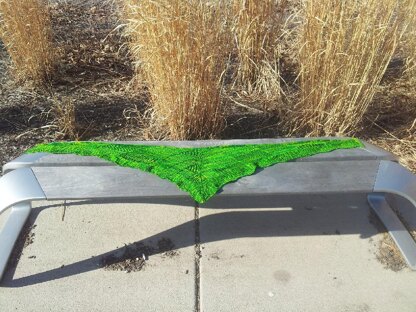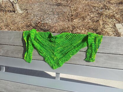 An elongated shawl pattern featuring different textures seperated by slipped stitches with a knitted on border.