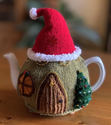 This pattern has been created using 2 strands off DK held together for the main cosy body, the remaining pieces are knitted using single strand of yarn. It is knitted flat and seamed. I used a Small amount stuffing for the roof, Beads for Xmas tree and bottom of roof,Snowflake embellishments, Clear adhesive for snowflake embellishments
