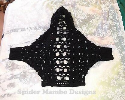 Hooded Cocoon style shrug made with an XXtra Creepy Skulls stitch pattern. Designed by Karen Rice. Pattern by Spider Mambo Designs