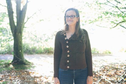 Xylia means ‘of the wooded land’ and characterises this pattern perfectly with its textured stitches reminiscent of bark. This asymmetrical cardigan is both feminine and functional to wear with its little pocket and scalloped edges.