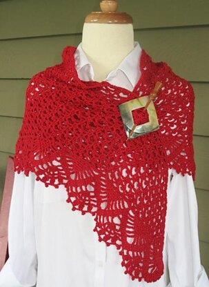 Yadkin, an elongated semi-circular shawl, is worked from neck edge to bottom, then the edging is added along the outer arch. The final trim is worked along the sides of the edging and across the beginning chain. Pattern includes written instructions (American crochet terms) and charts.