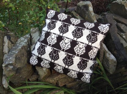 The cushion is knit in the round using 2 contrasting colours. The photography sample was knit in 4 ply Blacker Yarn, but West Yorkshire Spinners Signature 4 ply is suggested here as a suitable substitute as it is available through Love Knitting.