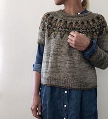 Yanis is worked seamlessly from the top down. First some short rows are worked back and forth to create a higher back neck and then the yoke is worked top down to sleeve separation. Some last short rows are worked to finish the yoke shaping right before sleeve stitches are placed on hold, then the cropped body is worked in rounds down to the contrast colored hem. Sleeves (short or long) are worked top down to the cuffs last.