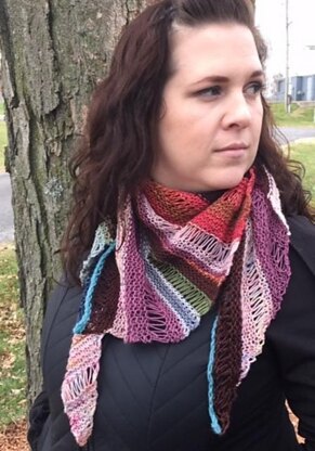 The repeat in this shawlette pattern uses yarn overs for shaping to create a one skein wonder. This quick knit is a great way to show case that long self-striping yarn you have been saving for a special occasion. For magical self-striping yarn, join about 300 yards of left over sock yarn with magic knots, as pictured in the sample shawllette.