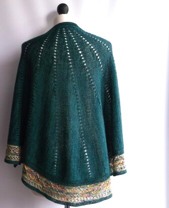 Starting with a provisional cast on, this shawl is worked sideways using short row shaping. A row of eyelets seperates and defines the wedges. Stitches are then worked along the top (including the provisional cast on stitches) to create a wingspan edge. Then they are picked up along the bottom edge to work an eyelet pattern in a contrast yarn.