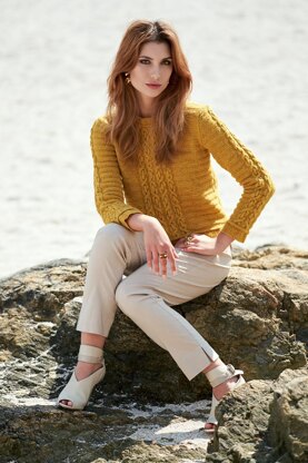 Elegant chain link cables framed by a welt pattern adorn this casual sweater. It is knitted straight from the bottom and up in parts with extra ease for comfort. Spindrift, a fine heathered wool was chosen for its lightness and color. The round neck makes it easy to wear over a crisp shirt or your favorite t-shirt.