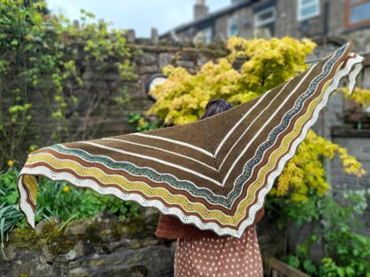 I am very lucky to live within walking distance of some absolutely beautiful countryside. As a family we can often be seen tramping over the hills armed with a picnic and an over excited dog. One such walk in to the moors inspired the colour choices and name for this shawl. Stoney pathways across boggy valley bottoms and a hoar frost on the grasses covering the hills, with a rest stop for tea and biscuits sat on a rock next to a reservoir.