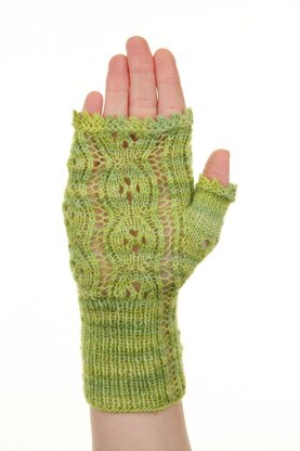These delicate gloves feature an easily memorized lace pattern that is worked on every row. They are knit with negative ease so that the lace pattern opens fully when worn.