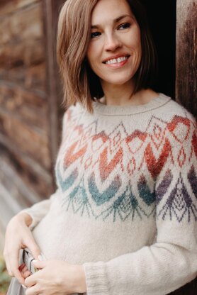 Gauge: 26 sts & 32 rows = 10 cm / 4” in Stockinette stitch and colourwork in the round on larger needles, blocked.
