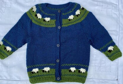 The patterns is knitted in sections until the yoke when all pieces are joined together. Full skeins are needed for the green and the blue but only small amounts for the sheep. You will need 4 or 5 buttons depending on size