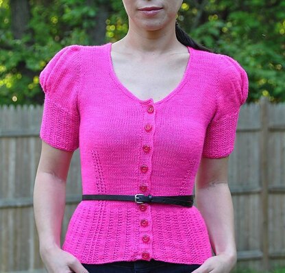Yosemite Falls is a petite, figure hugging cardigan featuring cascading wavy panels on the back and flattering vertical lines on the front. Romantic puffy sleeves round out this beautiful cardi. Very simple to knit, with seamless top down construction that allows you to try it on as you go and adjust size as needed for a perfect fit. This versatile cardigan accentuates your curves and looks fantastic when paired with a fancy dress, or just plain jeans.