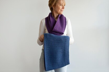 My sentimentally named You & You Too design is a lace cowl that I've worked up twice – first in sport weight (purple) wool and then again in a similar weight (blue) cotton. Although making both was not my original intent (I got to work on one while waiting for yarn delivery of the other), once done I felt their differing characters and multi season appeal warranted dual display. These cowls are worked from the top down, in the round, beginning with a tall rib. Openwork Rib Lace – an easy to master 4 row repeat – is worked throughout its middle, its 5 stitch version gradually transitioning to 6 as it tapers to the hem, and finishes with a shorter rib.