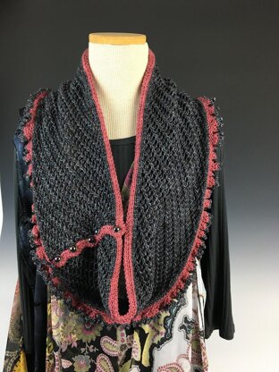 This is a generous sized cowl that is knitted in a beautiful lace pattern and is then edged in a seed stitch icord and picot ruffled edge. Lots of edging techniques to play with. The contrasting edging uses approximately 115 yds of fingering weight.
