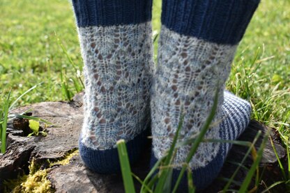 The socks begins with contrast colour and toe, then you knit stripes 3 rows/ 3 rows with both colours and after the heel with contrast colour, knit the ankle as indicated in the lace design, and finish with ribbed cuff with contrast colour.