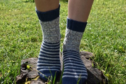 La chaussette commence par la couleur de contraste pour la pointe des pieds et ensuite, il faut tricoter des rayures 3/3 avec les deux couleurs, passer le talon avec la couleur de contraste et reprendre la cheville en couleur principale avec un design de dentelle. Enfin finir la chaussette avec la couleur de contraste et des côtes.