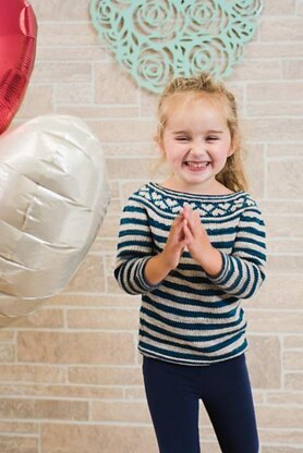 This pullover is worked from the top down, seamlessly. There are a few increase rounds worked in the striped sections of the yoke. The sleeves and body are divided at the underarms and worked separately from the top down, making it easy to adjust the lengths to fit your child.